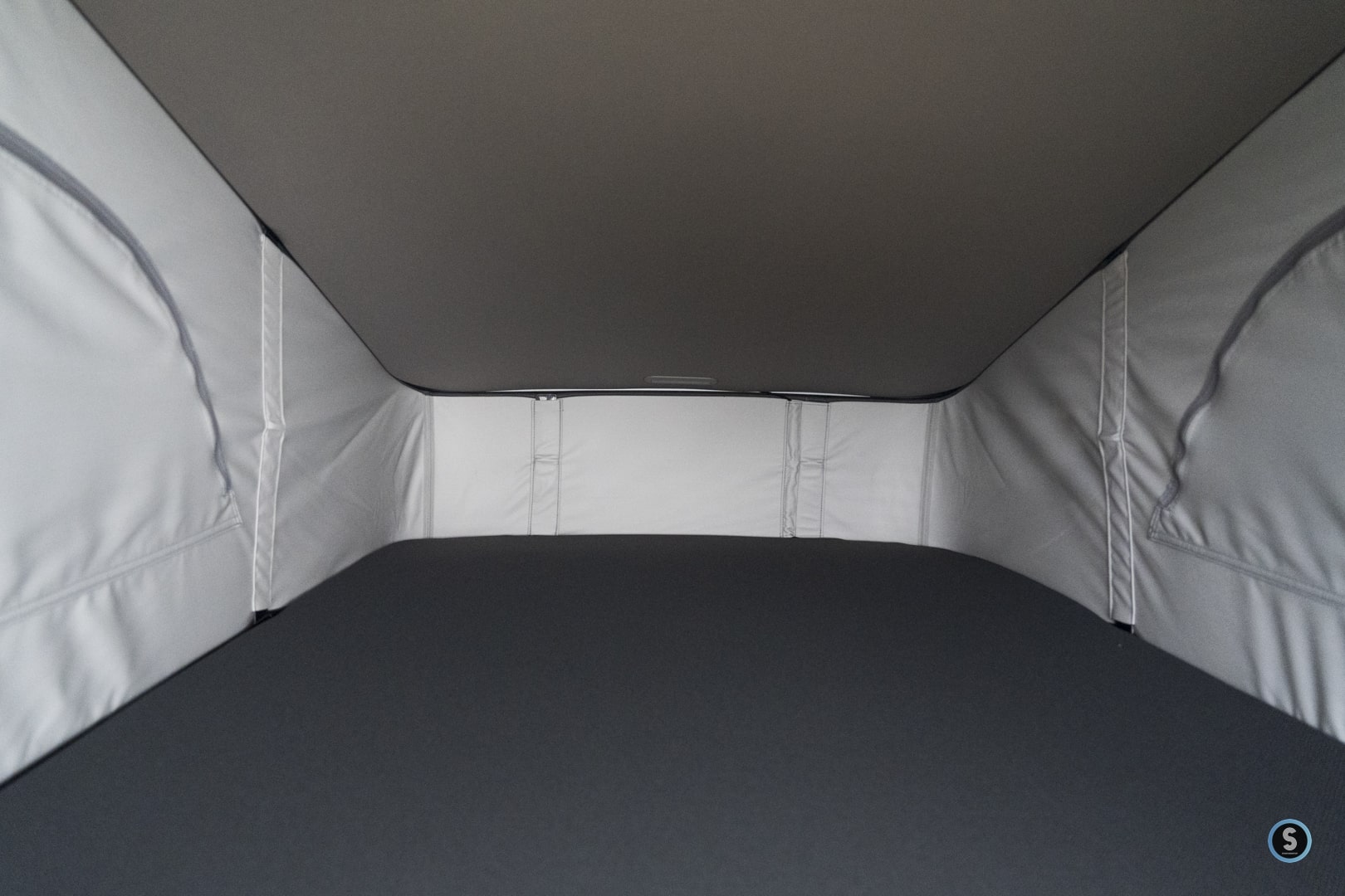 Le toit relevable emblématique cache un lit de 2 054 x 1 137 mm, accessible grâce à une échelle discrète. C’est d’ailleurs le lit le plus confortable des deux. Ce couchage à l’étage est idéal pour deux personnes et permet de profiter de la vue grâce à une ouverture avant panoramique.