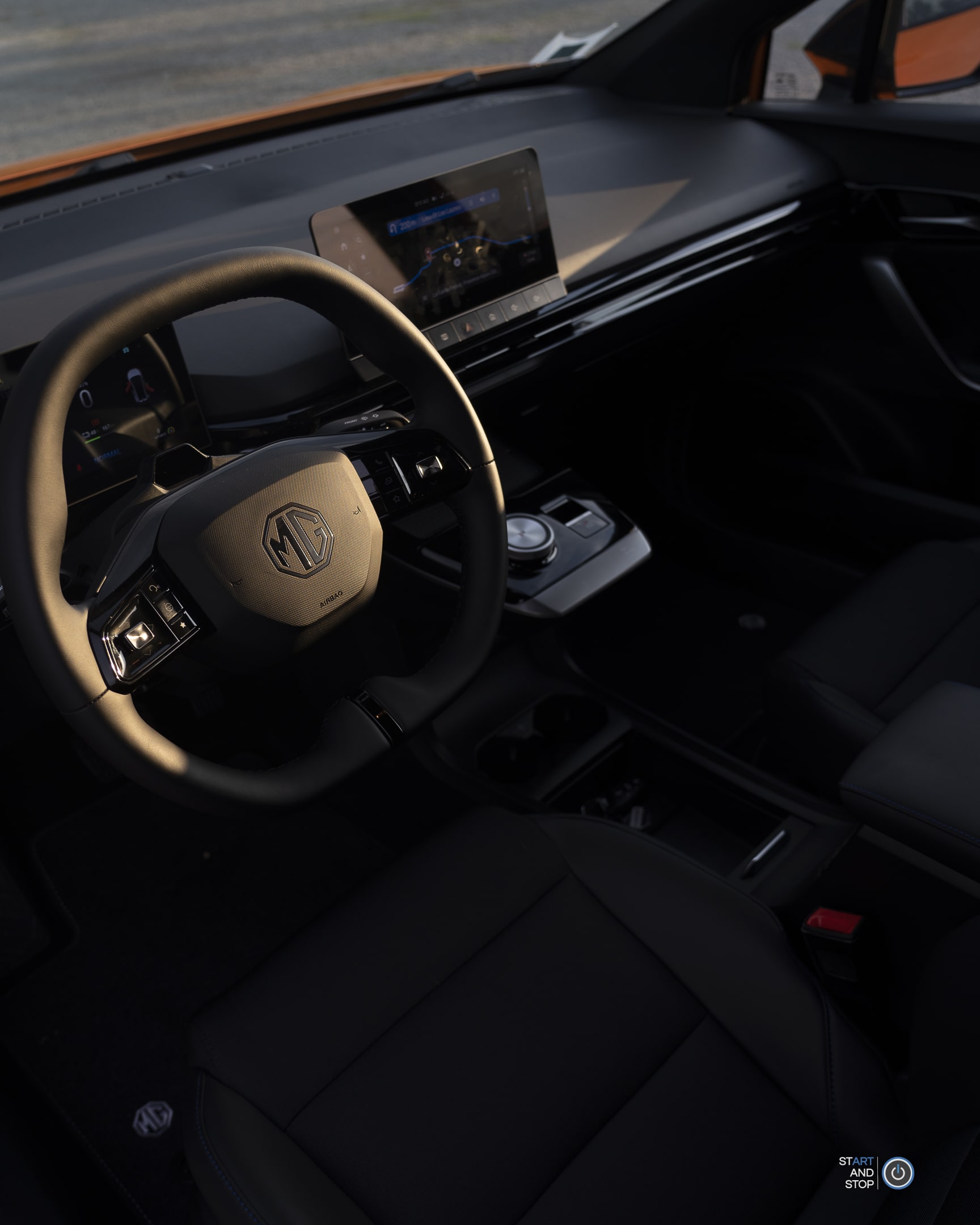 Une fois sur le siège conducteur, je règle mon siège électriquement, je règle la hauteur et la profondeur de mon volant, je ferme la porte, j’appuie sur le frein, je positionne la molette sur D, j’appuie sur l’accélérateur et c’est parti ! Même plus besoin de bouton « Start & Stop ». Je m’engage sur une deux voies et l’accélération est surprenante. En effet, notre version dispose d’un moteur de 204 ch, un couple de 250 NM et d’une batterie de 64 kWh. Au niveau des performances, MG annonce un 0 à 100 km/h en 7,9 secondes. Durant ce trajet sur autoroute, on découvre un véhicule assez silencieux. Des bruits d’airs font leur apparition néanmoins à partir de 120 km/h. Les sièges sont confortables, les suspensions correctes et le ressenti de la direction est bonne. À première vue, cette MG4 joue très bien son rôle, on y voyage confortablement.