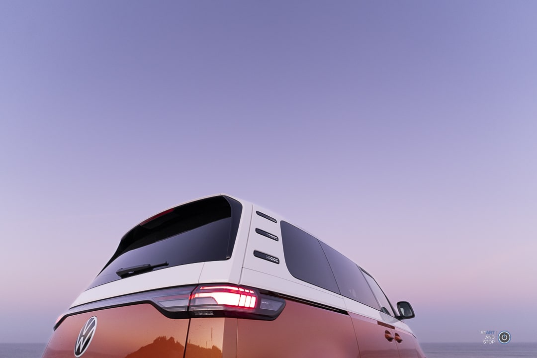 Sous cet angle, l’ID Buzz dévoile son empattement relativement long avec aux extrémités de belles jantes 21 pouces Bromberg. Pour entrer à l’arrière du véhicule, il faudra ouvrir l’une des deux portes coulissantes qui peuvent avoir en option un système automatique d’ouverture et de fermeture. Sur la custode arrière on remarque 3 petites baguettes. Ceci est un clin d’oeil stylistique fait au T3.