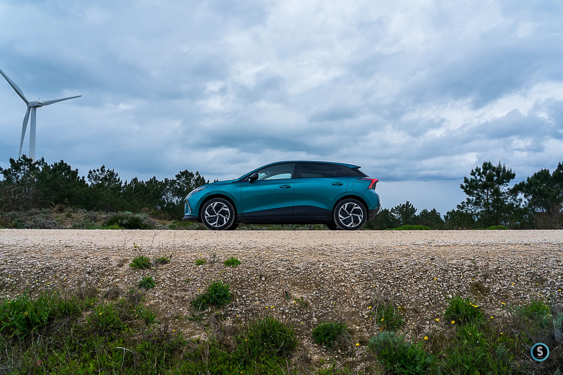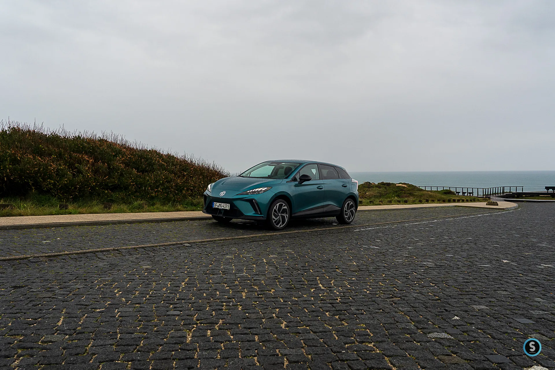Mais c’est surtout dans cette nouvelle teinte Irises Cyan que la MG4 EV attire véritablement l’œil. Entre bleu profond et reflets turquoise, elle capte la lumière – même sous un ciel chargé – et met en valeur les lignes tendues du profil ainsi que les volumes sculptés de la carrosserie. Dans la grisaille portugaise, cette couleur apporte une vraie signature visuelle, presque inattendue, qui contraste avec l’ambiance sombre et souligne le caractère moderne et accessible de cette compacte électrique.